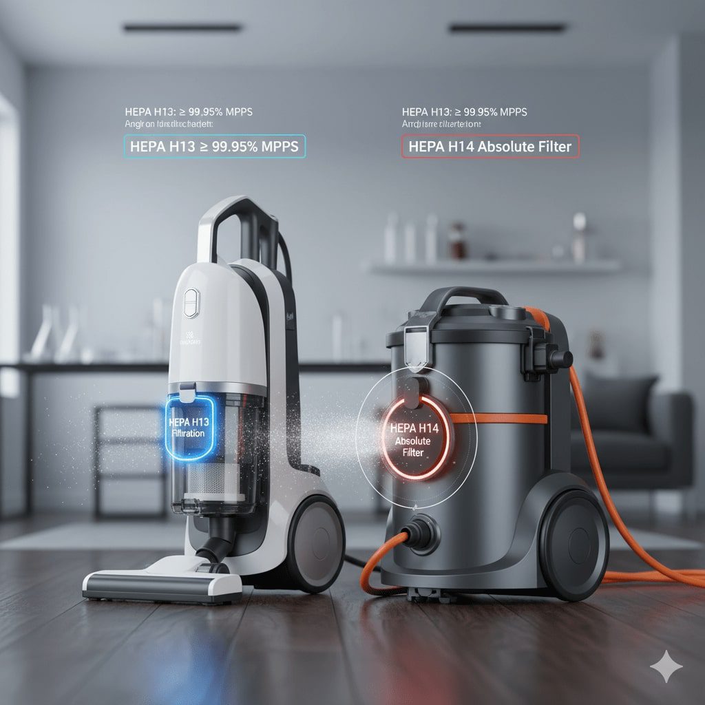 - De plus, un H13 bien entretenu dans un aspirateur avec un système étanche (le facteur clé !) sera toujours plus efficace qu’un H14 mal scellé.